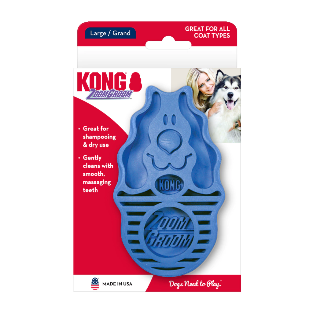 KONG ZoomGroom é uma verdadeira máquina de tirar pelos mortos dos cães quando usada a seco e uma verdadeira máquina massageadora e limpadora quando usada no banho. Uma escova desenvolvida há muitos anos, mas que continua moderna e atual, sendo altamente recomendada pelos tutores mais cuidadosos e apaixonados pelos seus cães. Feita 100% de borracha é leve e não machuca ou irrita a pele do animal, nem repuxa os pelos.