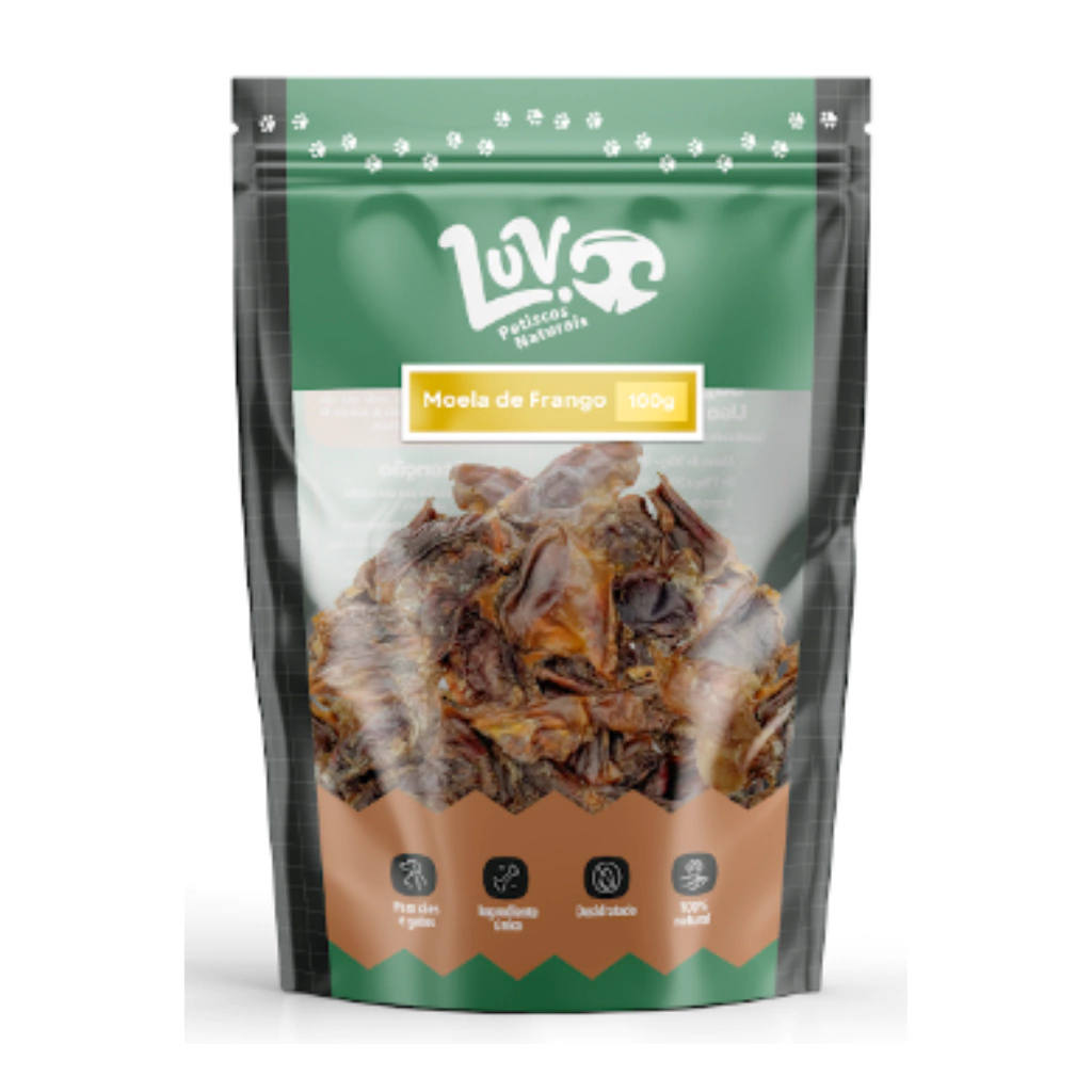 Contém 100g de Moela de Frango desidratados lentamente em baixa temperatura.