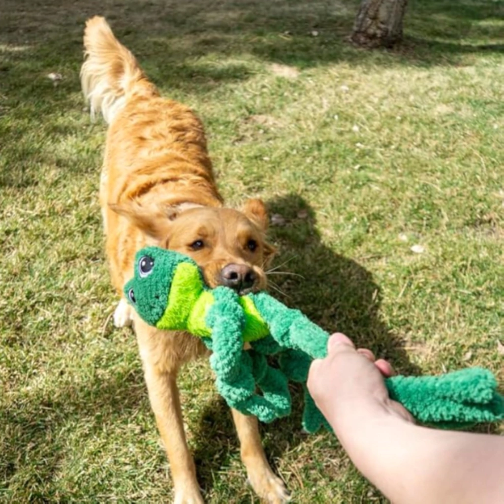 Kong Knots Frog é um brinquedo super grande (46cm) que possui corda com nós em toda sua extensão para proporcionar brincadeiras de cabo de guerra e de jogar e buscar, super divertidas. Sua estrutura aumenta a resistência e durabilidade. Além disso, é um ótimo brinquedo para aconchegar. Ideal para cães com mordidas leves a moderadas. Possui um apito na cabeça para aumentar o engajamento. Importante: Não é um objeto de roer. Não deve ser deixado sozinho com o cão nem por alguns minutos, até ter certeza de que o cão não irá destruí-lo. Destinado à cães com mordidas leves. Para cães com mordida forte e destruidores, prefira os brinquedos de borracha natural. Acabada a brincadeira, guarde para a próxima. A garantia não cobre danos feitos pelo cão, apenas defeitos de fabricação. Siga as dicas de uso e indicação de tipo de cão. Composição: Tecidos e apito