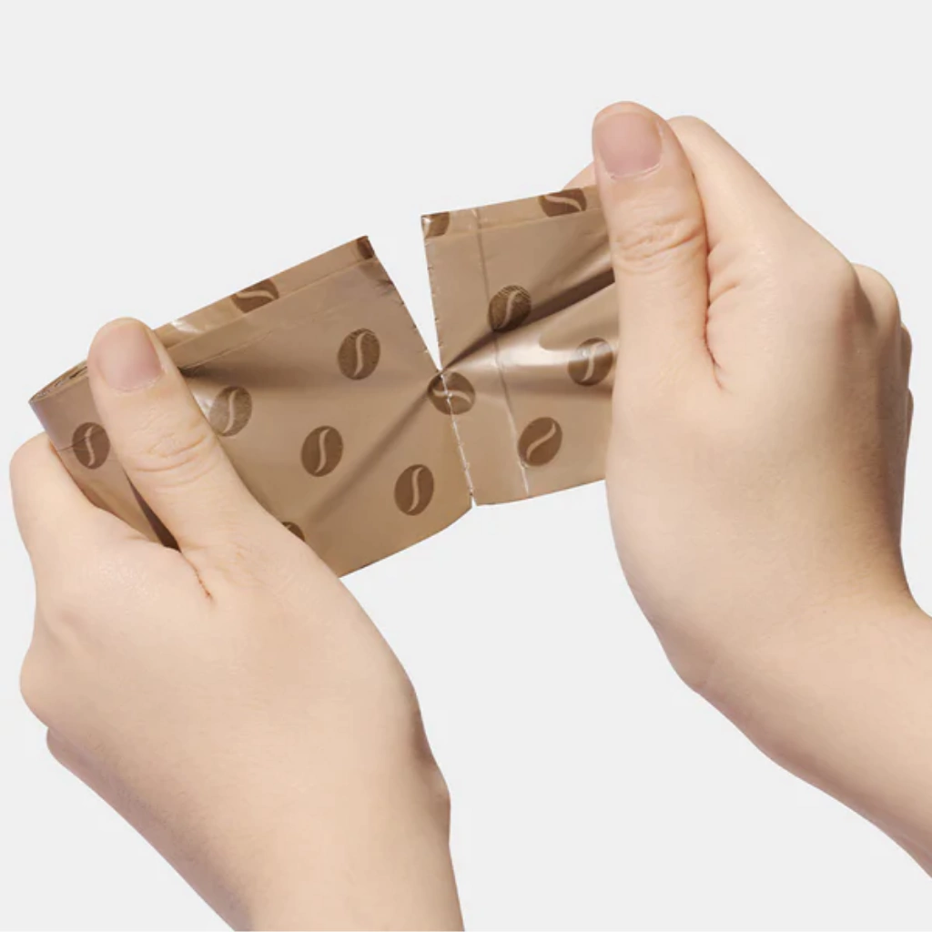 Os próprios sacos são ecológicos, resistentes e infundidos com uma fragrância fresca de café, tornando as limpezas mais agradáveis e menos odoríferas.